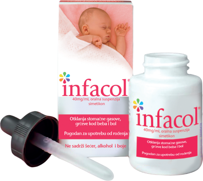 Infacol sadrži simetikon – antiflatulent koji razbija sitne mehuriće gasa u bebinom stomaku, spaja ih u veće mehuriće i omogućava njihovo lakše otpuštanje. Na taj način smanjuje osećaj nadutosti i nelagodnosti.